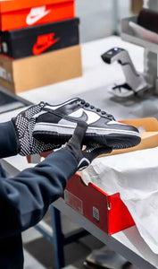 Ao chegar em nosso estoque, nosso time verifica múltiplos pontos: caixa, costuras, logos, solas, etiquetas de numeração, cheiro, rigidez do material e mais.